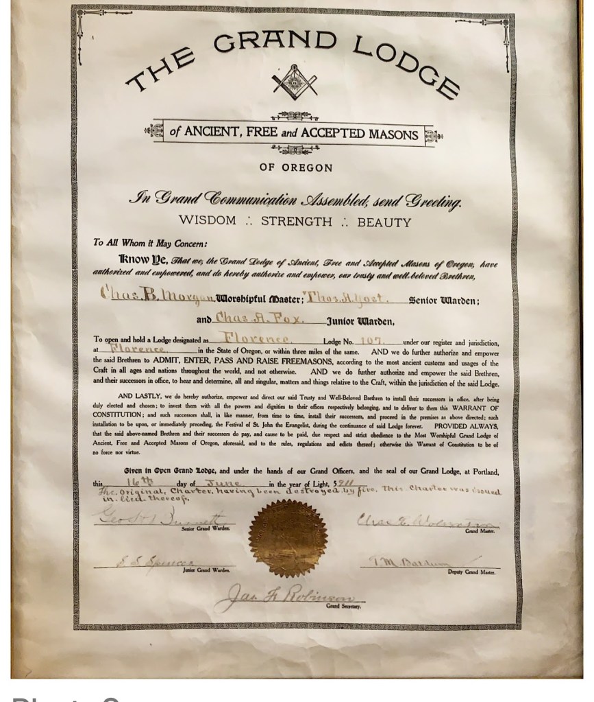 Florence Masonic Lodge No. 107 was chartered by the Grand Lodge of Ancient Free and Accepted Masons of Oregon in 1893. A replacement charter was presented to the Lodge on the 16th day of June, 1911 because the original was destroyed by fire. The Lodge’s history dates back to before the town of Florence was established.