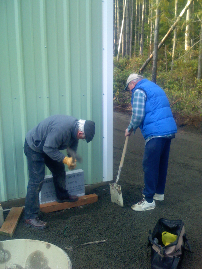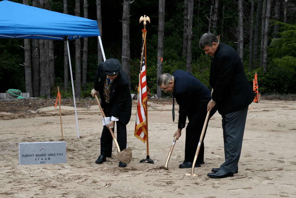 After a long application process, with Lane County and The State of Oregon, a groundbreaking ceremony took place on March 17, 2007 at the new Lodge site at 84910 Highway 101 South. The ceremony was followed with lunch at the Odd Fellows Hall on South Jetty Road. The public was invited to attend. This meeting was attended by about 70 people, members and public. RWB Roger Booher, DDGM represented the Grand Master.