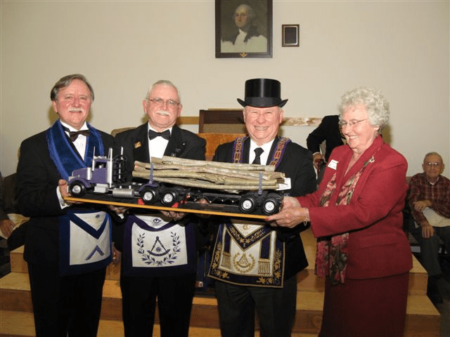 WM David Chester presided over a meeting, on January 2, 2009, and Most Worshipful Brother Robert Richmond, Grand Master of Masons in Oregon dedicated Florence Masonic Lodge. Florence Lodge presented a model “Logging Truck,” to the Grand Master. This was in recognition of his many years in Forestry. WB Dick Tooley made the model truck out of wood.